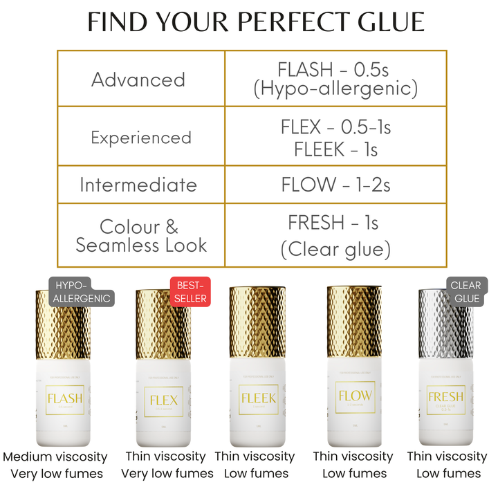 Meet our fast-drying eyelash extension glue - FLEX is designed to be long-lasting and also causes less irritation, suitable for experienced lash artists, not suitable for beginners